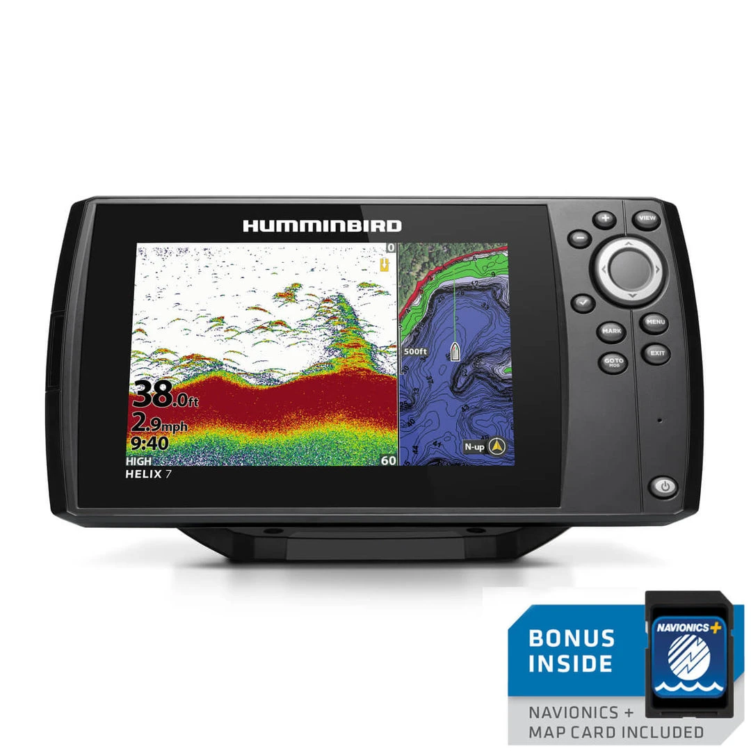 The HELIX 7 CHIRP GPS G3 NAV+ fish finder features Dual Spectrum CHIRP Sonar, AutoChart Live, GPS and Humminbird Basemap built-in. The 7″, ultra-wide display gives you ample room to view the many pre-loaded split screen view options. This unit includes a Navionics+ map card with data for over 21,000 lakes in the U.S. and Canada.