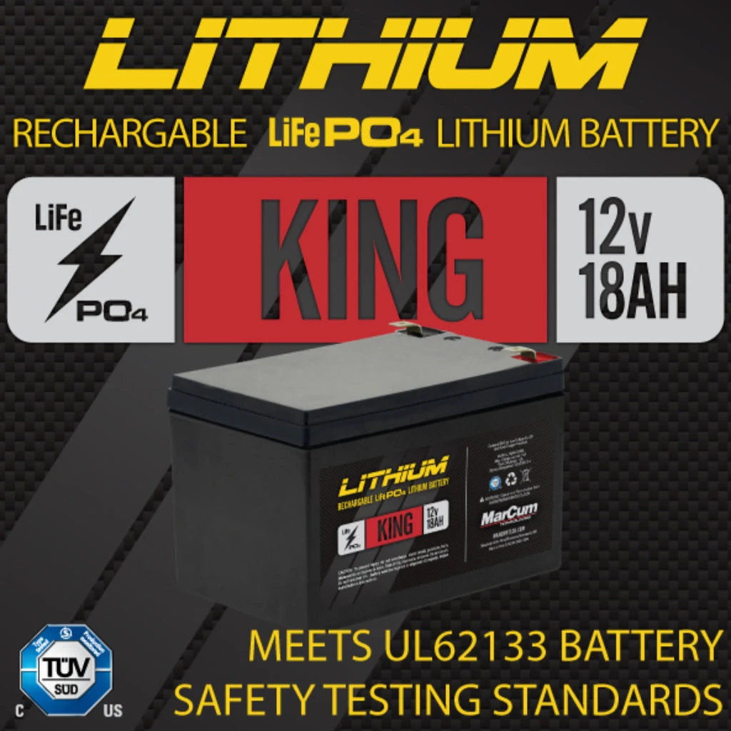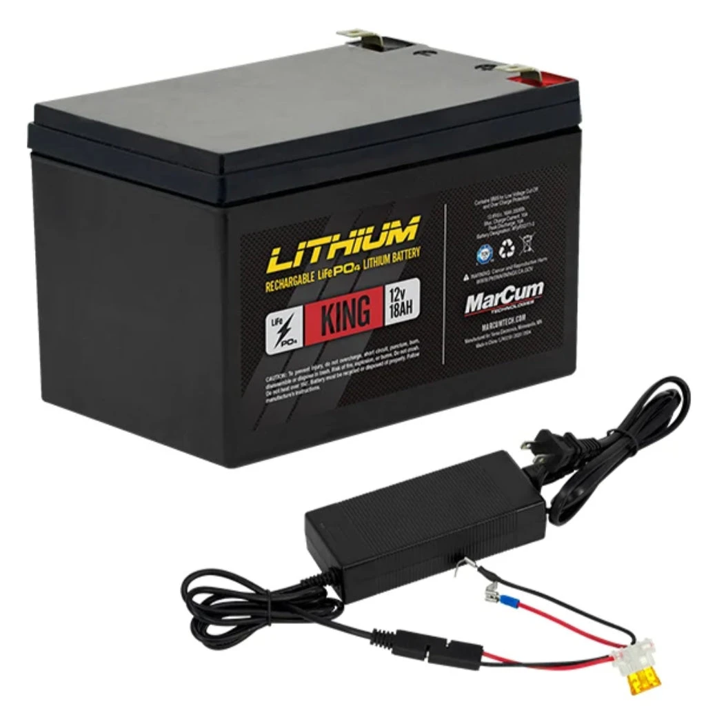 MarCum realizes that there are certain systems designed for open-water which are also run on ice. These units typically have a higher power draw designed for deep cycle batteries. The MarCum King Lithium LiFePO4 at 12V18AH delivers deep cycle perfor-mance in a compact, portable form-factor. The MarCum King is equipped with a BMS circuit that protects the battery from overcharge, over dis-charge, and short circuiting. The performance doesn’t stop there, as the MarCum King kit is equipped with a multi-stage charger for fast initial charge, reduced-charge near full, and a maintain charge cycle to prevent overcharging. The MarCum King kit comes complete with battery, 6 AH charger, and fused charging cable. As a sportsmen, you rely on these power options to fuel your passion for the outdoors. You can trust MarCum as all of our Lithium and LiFeP04 products are tested and certified to an international quality and safety stand-ard.