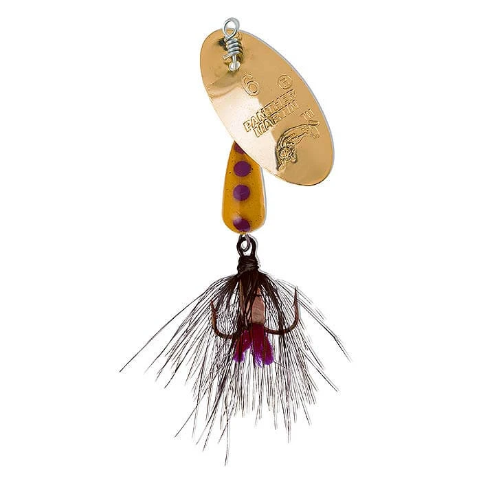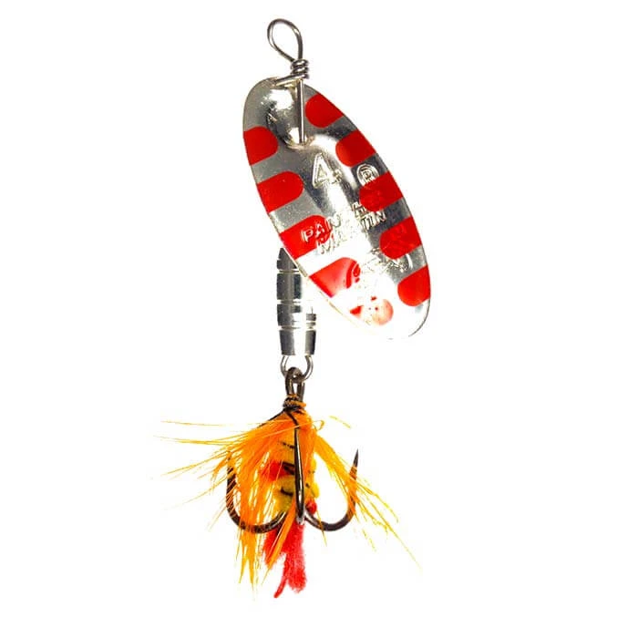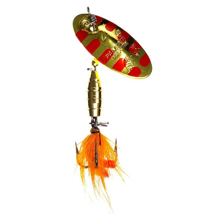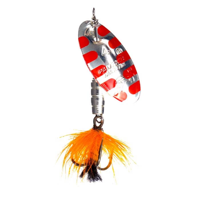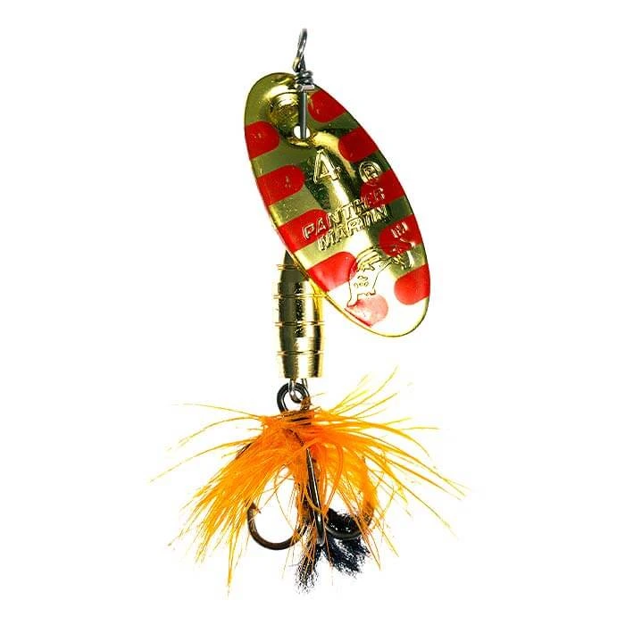 Panther Martin Fly spinners include all of the features of the Classic Regular spinner and have colored bodies and natural colored hackles on the hooks to add to the natural flash of the blades. The combination of colors and hackles represents a variety of food that fish feed on.
