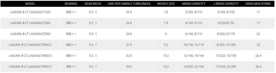 Available in 1000 to 3000 series sizes the Daiwa Laguna LT is a versatile line of workhorse reels, designed to put anglers of all skill levels in the high tech world of spinning reels. If you want to experienced the best of Daiwa engineering at a smart price, look for the new, reengineered Laguna LT spinning reel.